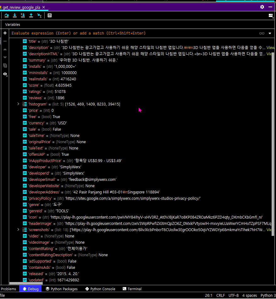 | 파이썬[Python] 구글 앱 평점 및 리뷰 클롤링을 위한 google_play_scraper 설치하기 (0) | 2023.01.24 |