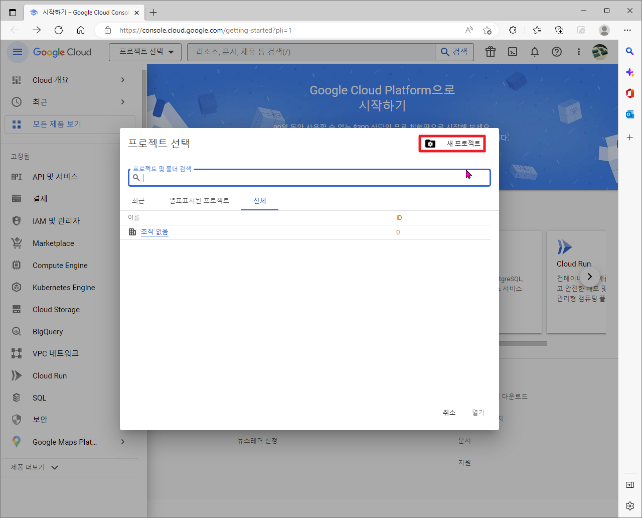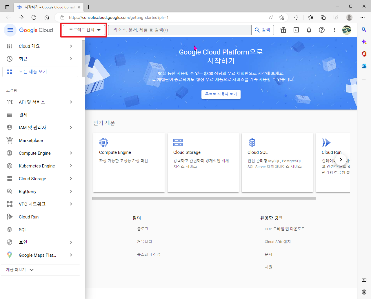 여기에서 상단에 보이는 [프로젝트 선택] 부분을 클릭하여 주시길 바랍니다.