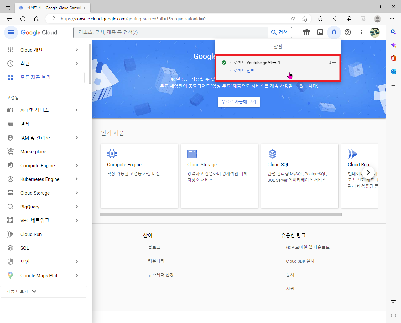 이와 같이 프로젝트가 생성이 되면, 알림 창에 프로젝트 생성이 나타날 것입니다. 이 때, 방금 생성된 프로젝트 만들기 알림을 클릭하여 주시길 바랍니다.