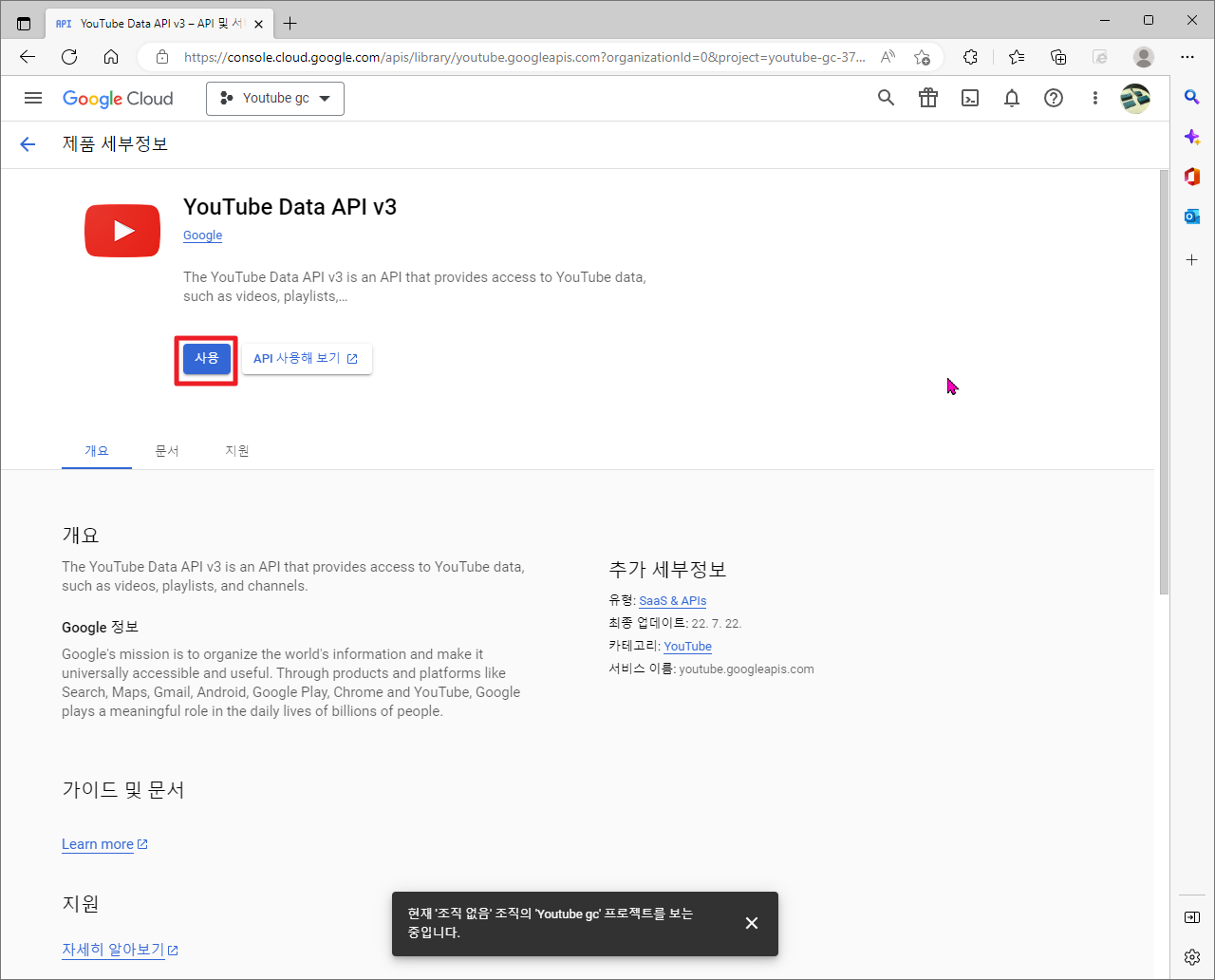 그럼 여기에서 " You Tube Data API v3"라이브러리를 사용하시려면, 보이는 바와 같이 [사용]부분을 클릭하여 주시길 바랍니다.
