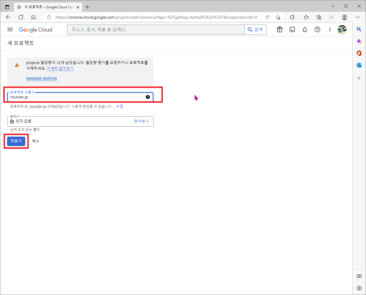 그럼 여기에서 원하시는 프로젝트 이름을 입력하시고, [만들기]부분을 클릭하시면 됩니다.