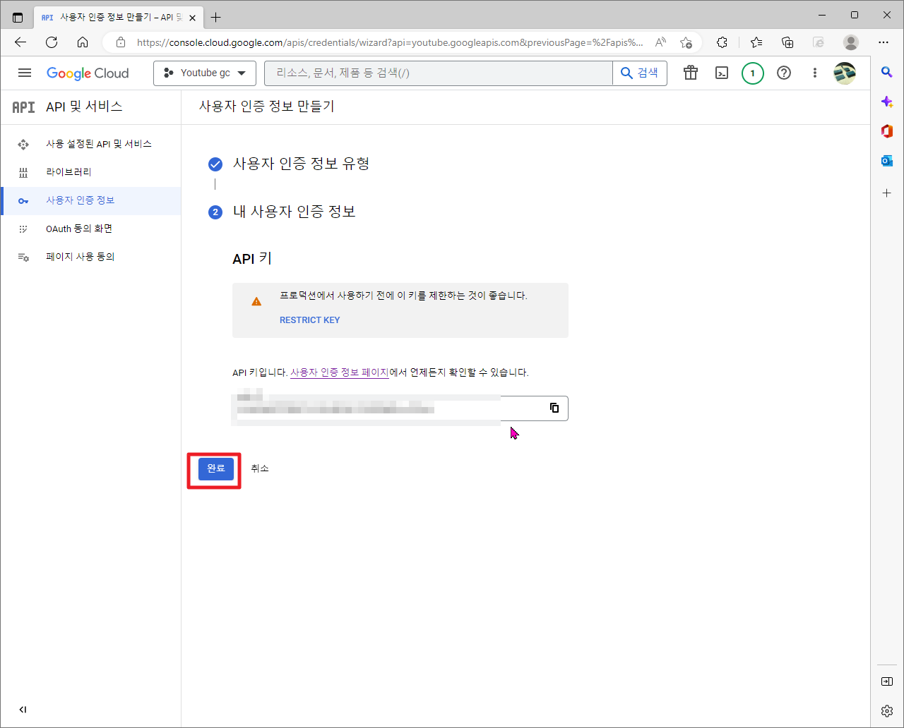 그럼 여기에서 API 키 가 생성이 됩니다. 이 부분을 이용하여 파이썬등에서 Youtube API를 사용할 수 있습니다. 여기에서 생성된 키를 확인 및 복사 하신 후에 [완료]부분을 클릭하여 주시면됩니다.