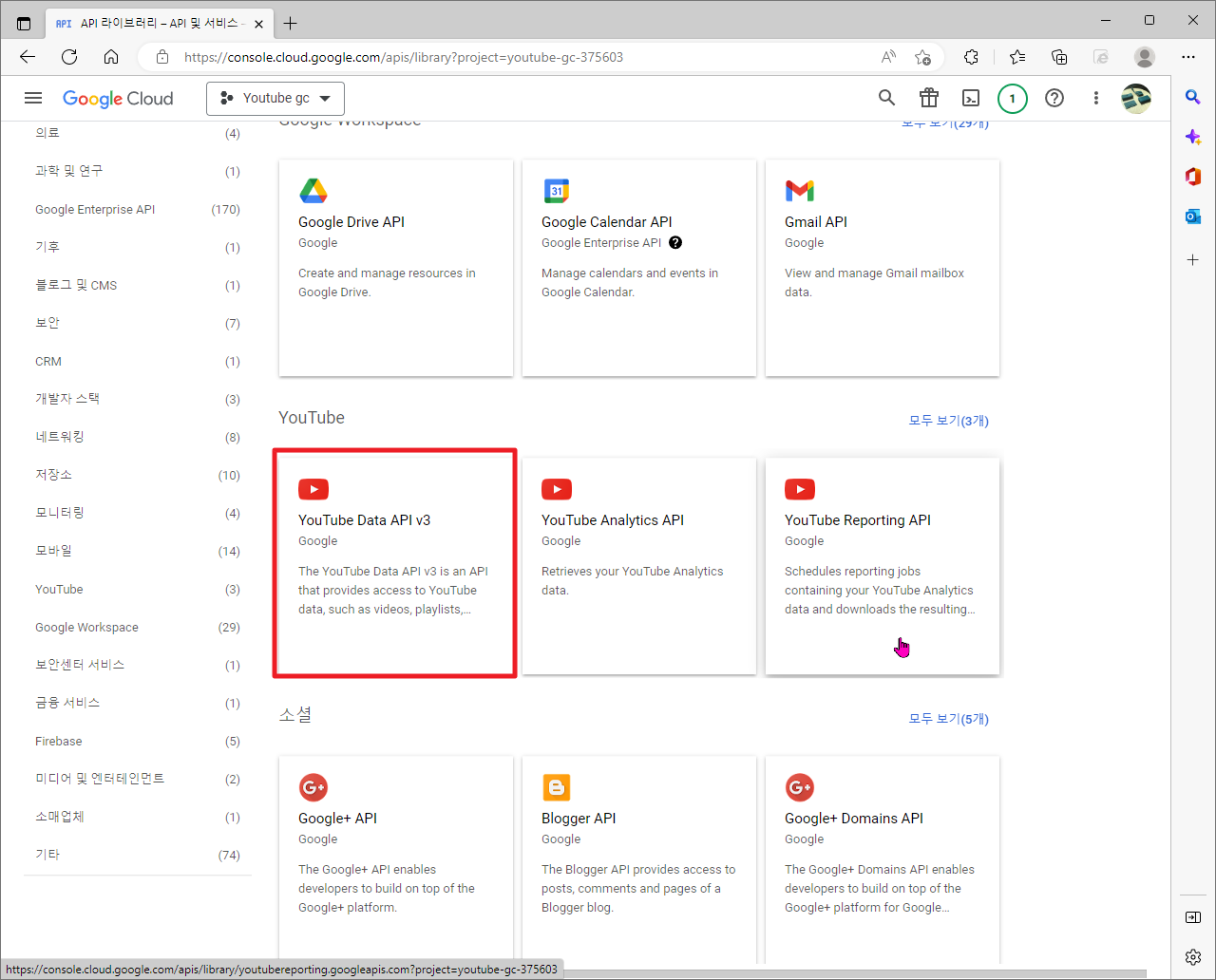 여기에서 라이브러리쪽을 스크롤 다운 하시다보면, " You Tube Data API v3" 및 관련된 부분들이 보일 것입니다. 저의 경우 " You Tube Data API v3"부분만 필요하기 때문에 이 부분만 클릭하겠습니다.