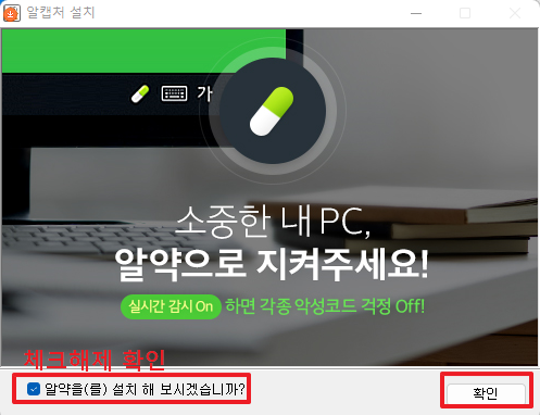 그리고 위와 같이 설치가 진행이 된다가 모두 완료되면 다음과 같은 화면이 나타날 것입니다. 저는 다시 알약 설치에 대한 권유에 대해서 체크 해제를 하고 [확인]부분을 클릭하여 설치를 완료하겠습니다.