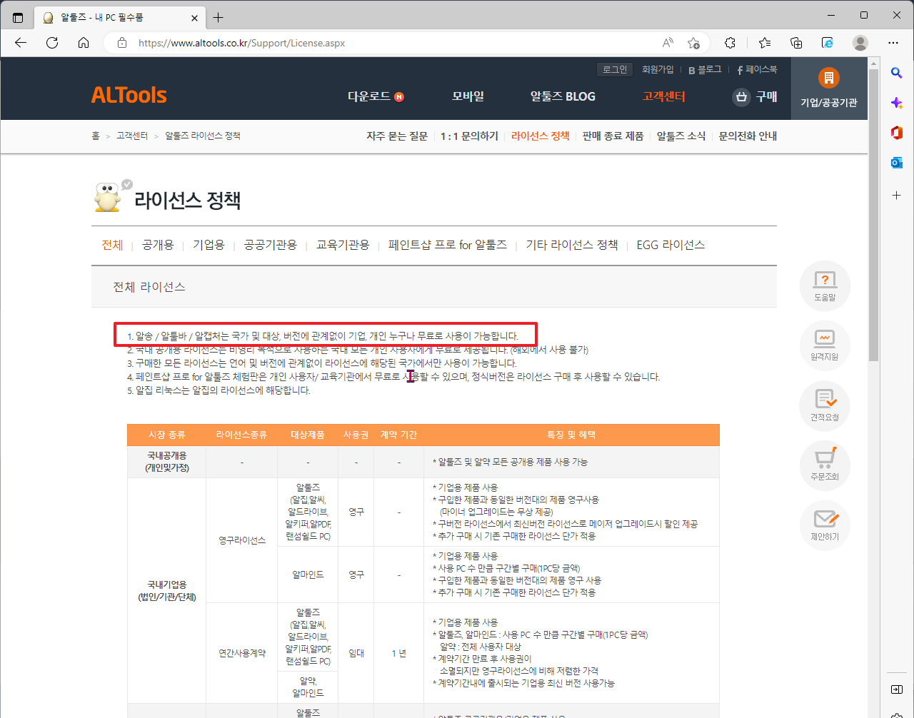 물론, 여기에서 한가지 주의 해야할 점이 있습니다. 바로 라이선스 정책입니다. 일반적으로 버전에 따라서, 프리웨어일수도 있고 쉐어웨어일수도 있습니다. 즉, 비상업적으로 사용할 경우에는 무료이지만, 단체 및 기업에서 사용할 경우 비용을 내야하는 툴일 수 있다는 이야기입니다. 그래서 일단, 23년 01월 24일 기준으로 되어 있는 라이선스 정책으로는 알캡처(캡쳐)의 경우 프리웨어 입니다.