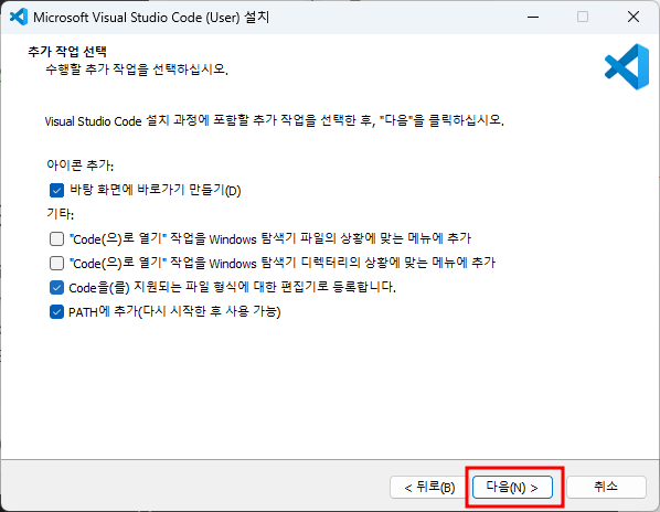 그런 후에, 추가 작업 선택에서 원하시는 부분을 선택하신 후에 [다음]부분을 클릭하여 주시길 바랍니다.