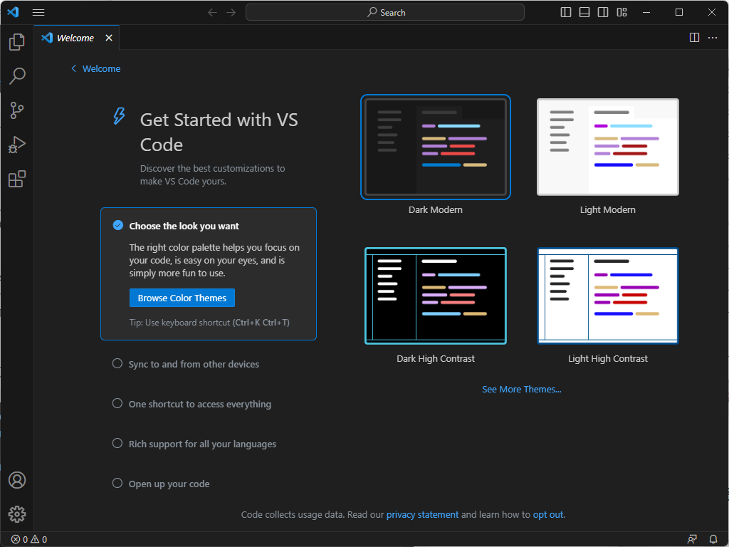 위와 같은 과정으로 정상적으로 실행이 되고, MS VS Code가 설치 된것을 알 수 있습니다.