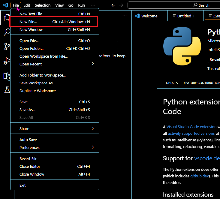 물론, 위의 과정만 가지고도 설치가 완료된 것을 알 수 있지만, 실제, 파이썬 파일을 하나 생성하여 해당 부분에 대해서 정상적인지에 대해서 알아보도록 하겠습니다. 먼저, [File]탭의 [New File]부분을 클릭하여 주시길 바랍니다.