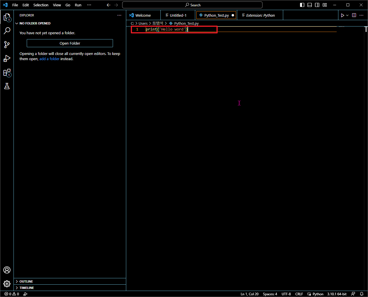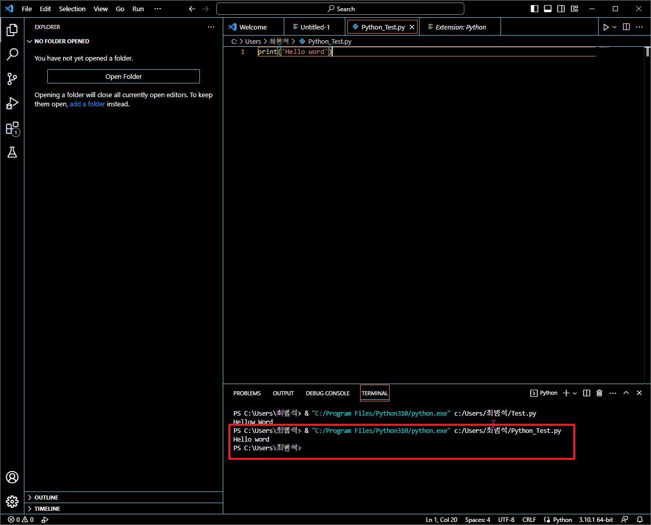 이와 같은 방법으로 VS Code에서 파이썬(Python) Extension을 설치하고 정상동작을 확인할 수 있습니다.