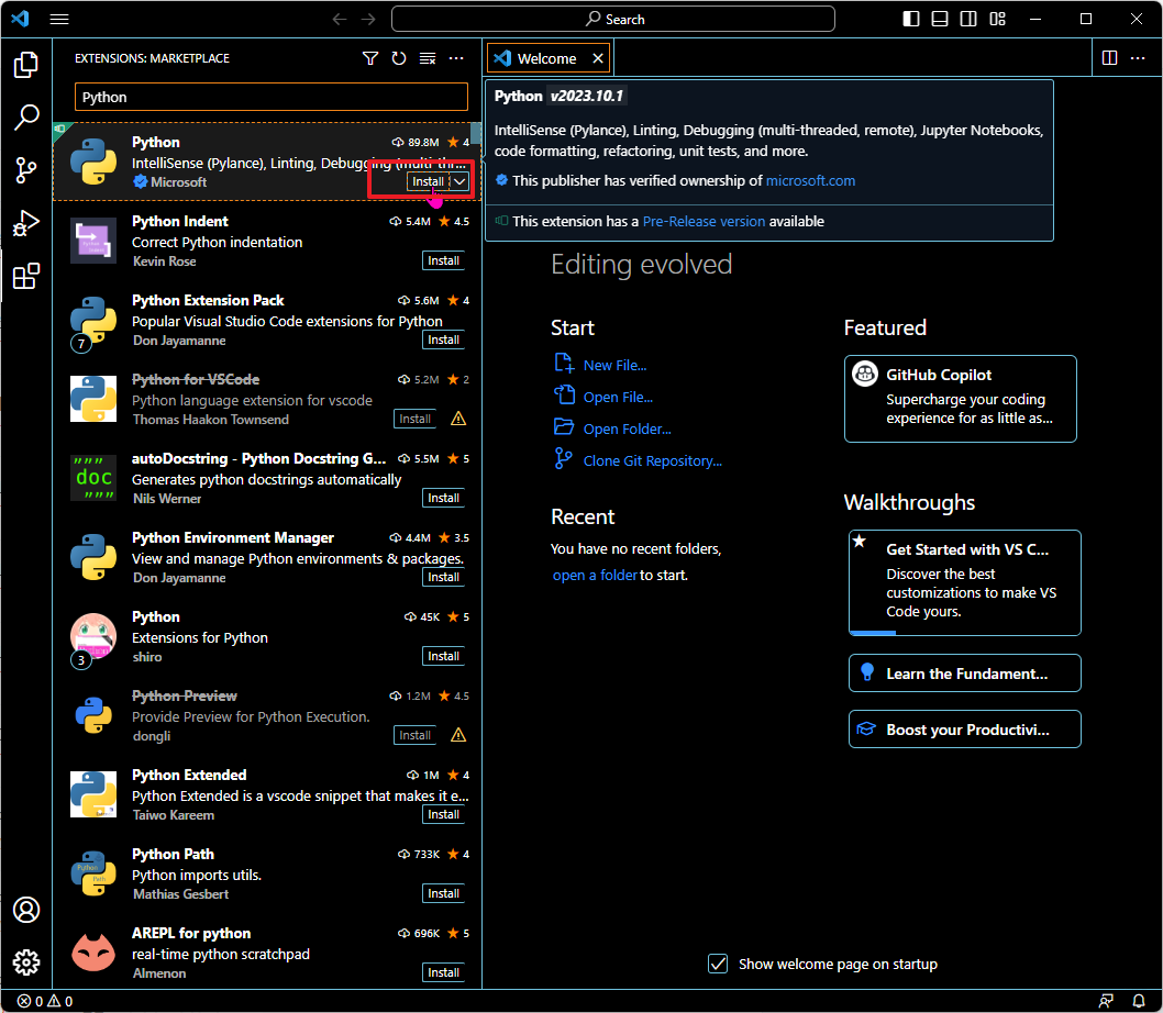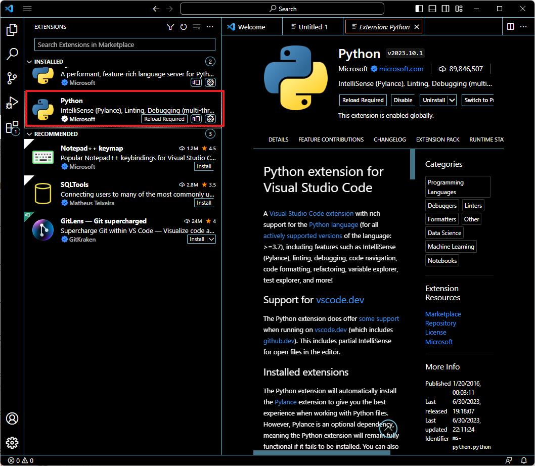 그런 후에 보시면 다음과 같이 Extension : Python이 설치가 완료된 것을 알 수 있습니다.