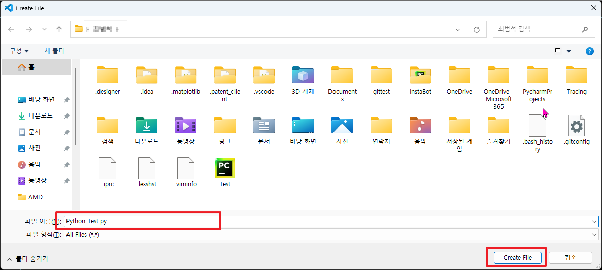 그럼 다음과 같이 경로를 입력하게 나타날 것이고, 파일이름에 파이썬 형태의 확장자인 ('py')을 입력해주시길 바랍니다.