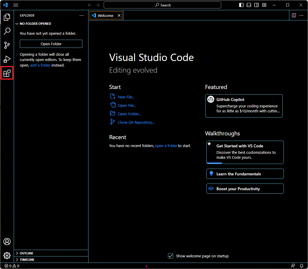 위의 링크에서와 같이 VS Code를 설치하고 실행하면 다음과 같은 화면이 나타날 것입니다. 여기에서, 좌측에 보이는 아이콘 중에 가장 하단에 있는 부분을 클릭하여 주시길 바랍니다.
