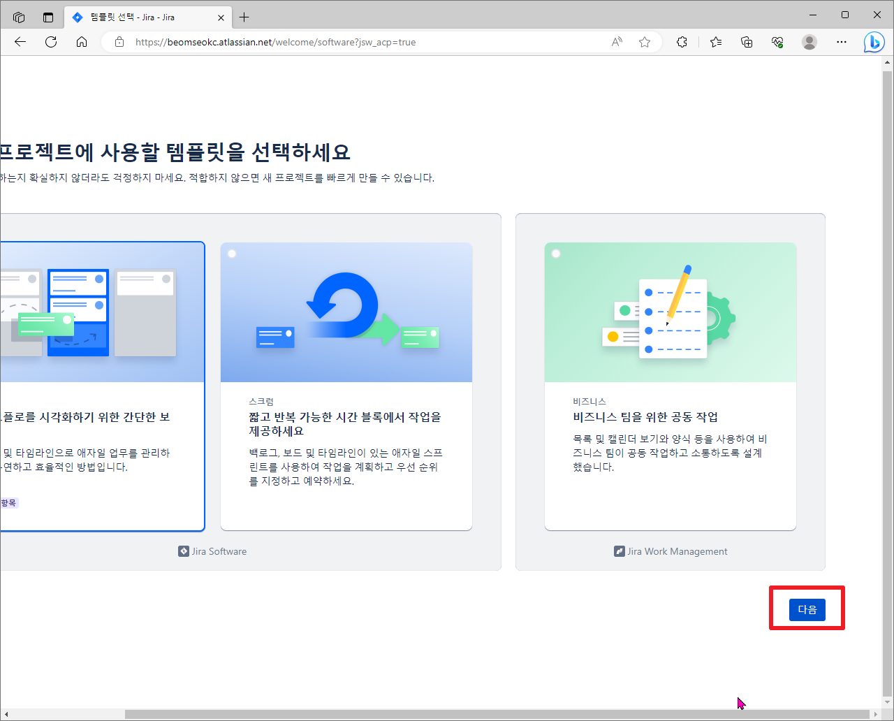 그리고나서, 현재 사용하고자 하는 Project에 대해서 어떤 부분으로 진행할 것인지에 대해서 템플릿을 선택하시고, 우측 하단에 있는 [다음]부분을 클릭하여 주시길 바랍니다.