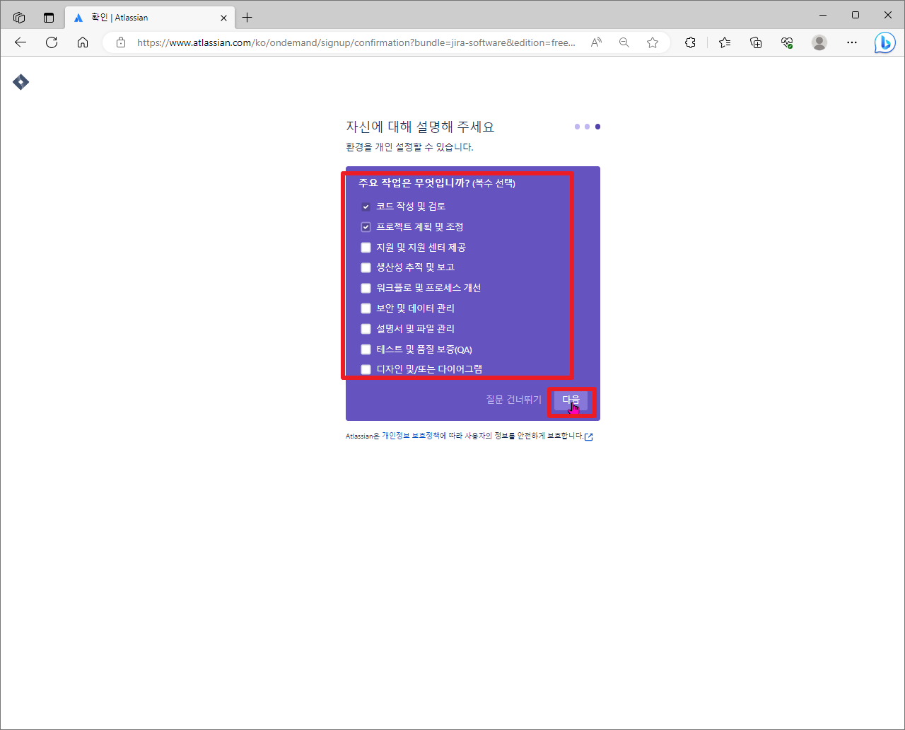 그리고, 현재 자신이 역할이 어떤 업무인지에 대해서 선택하시고, [다음]부분을 클릭하시면 됩니다.