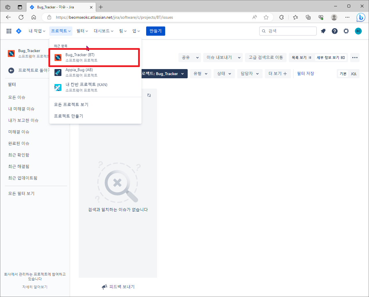 저의 경우 이름을 Bug_Tracker로 입력했더니, 키가 'BT'로 설정이 되었고, 그런 후에 [프로젝트 만들기]를 클릭하였습니다.