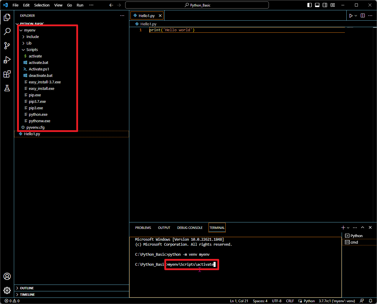 그럼, 좌측에서 보이는 바와 같이, 다양한 폴더가 생성이 될것입니다. 여기에서, 가상환경을 실행하기 위해서는 다음과 같은 명령어를 입력해서 실행하셔야 합니다.