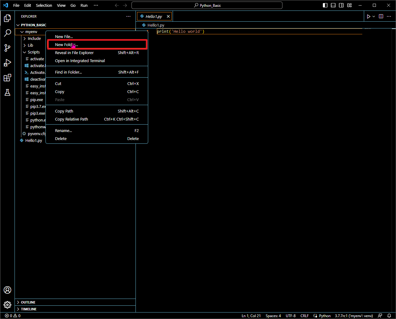 그럼, 일단 이전 포스팅에서 생성한 바와 같이 생성한 가상환경(venv)인 myenv폴더에 마우스 오른쪽 버튼을 클릭하여 주시길 바랍니다. 여기에서 [New Folder...] 부분을 클릭하여 주시길 바랍니다. 그런 후에 폴더 이름을 입력해주시면 됩니다.