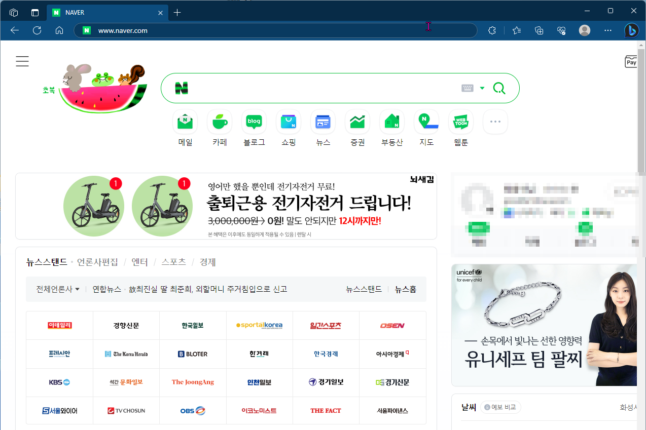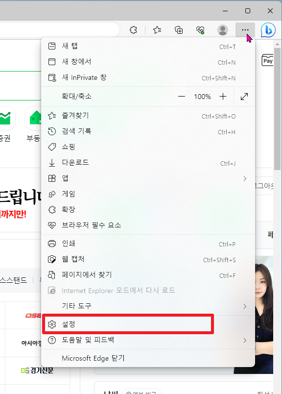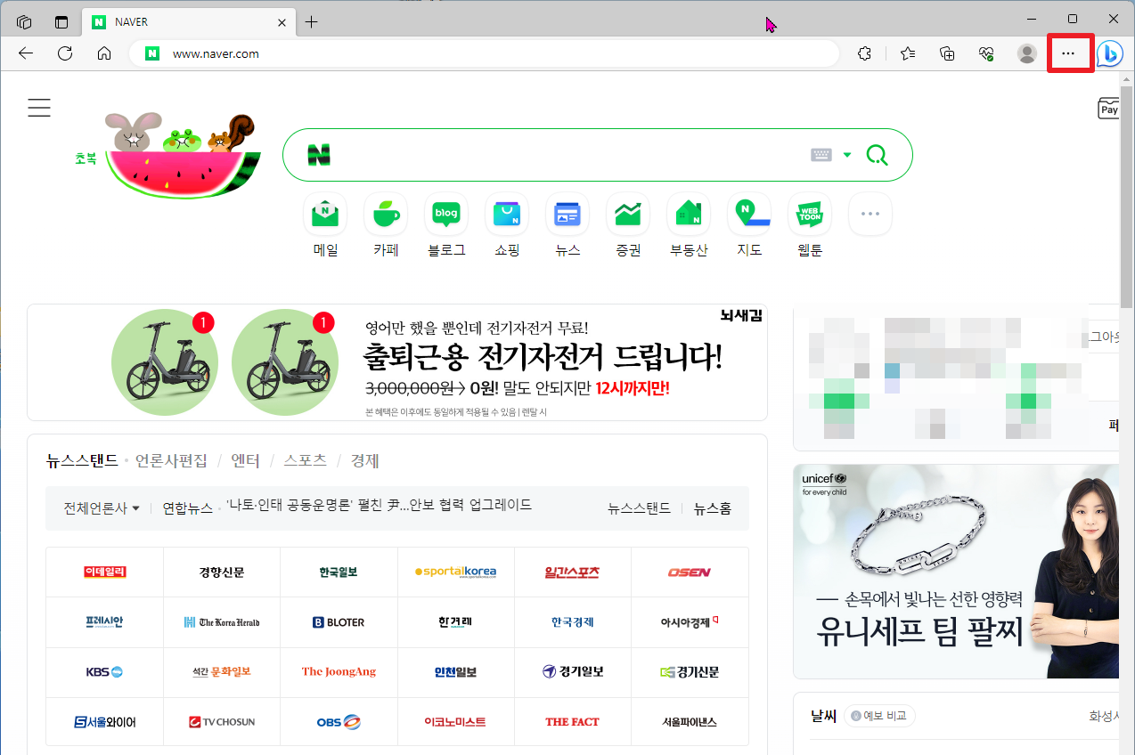 먼저, 엣지(Edge)브라우저를 실행하면 다음과 같은 화면이 나타납니다. 그럼, 여기에서 우측 상단에 보이는 빨간 상자 부분의 더보기(...)부분을 클릭하여 주시길 바랍니다.
