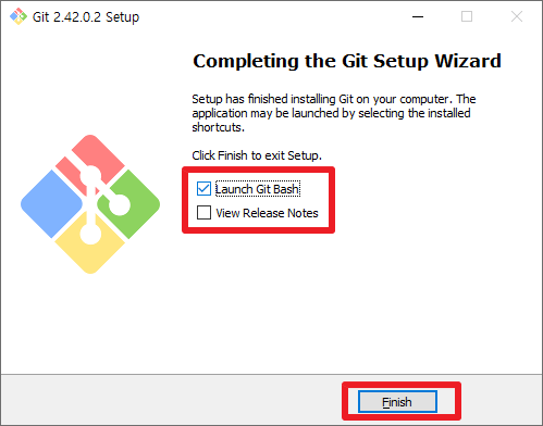 위의 과정 이후에 설치가 완료되면 다음과 같은 화면이 나타날 것입니다. 여기에서 [Launch Git Bash]부분을 체크 해주시고, [Finish]부분을 클릭하도록 하겠습니다.