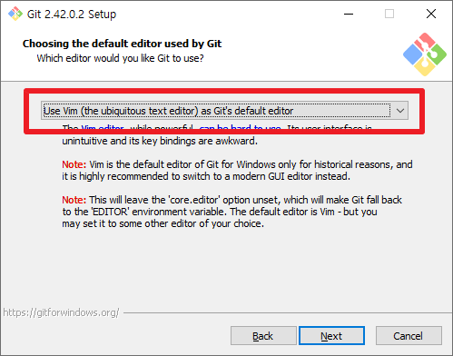 그리고, 이 부분이 가장 중요합니다. Git에서 기본으로 사용할 editor 파일을 설정해주셔야 합니다. vim이 기본 설정이나, 대부분 개발자 분들은 익숙하지 않기 때문에 저의 경우에는 Visual Studio Code로 변경하여 설치를 진행할 것입니다. 만약 Visual Studio Code가 없을 경우에는 하기에 있는 링크를 이용하여 설치해주시길 바랍니다. 여기에서도 원하시는 에디터 프로그램을 선택하신 후에 [Next] 부분을 클릭하여 주시길 바랍니다.