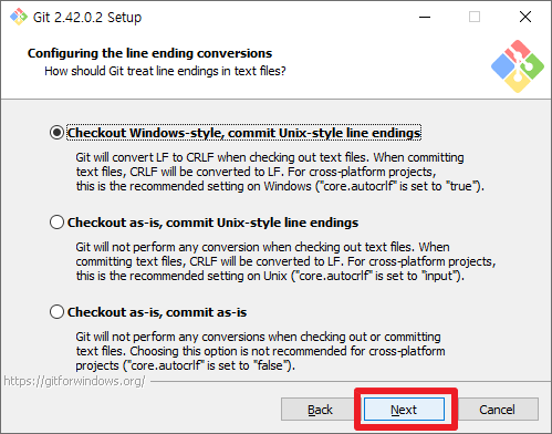 그 다음 단계는 Checkout / Commit 스타일에 대해서 설정하는 것입니다. 이 부분 또한 기본 설정을 유지하고, [Next] 부분을 클릭하여 주시길 바랍니다.