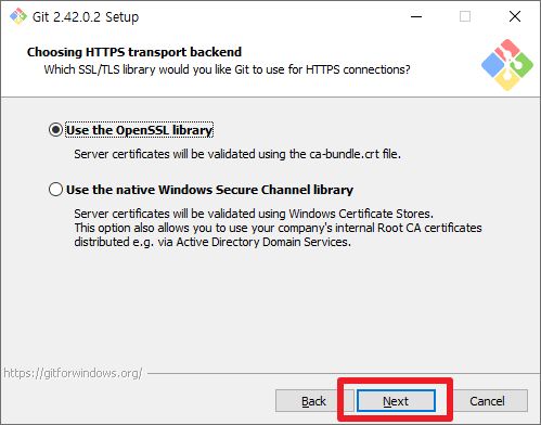 이제는 Git Bash에서 사용하는 터미널 프로그램을 설정하는 것입니다. 기본적으로 MinTTY을 제공하나, 윈도우에서 제공하는 Command Console을 선택할 수 있습니다. 저의 경우 MinTTY가 선택한 후 [Next] 버튼을 클릭하겠습니다.