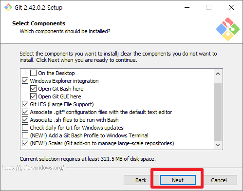 그리고, GIT 설치시에 각 구성 요소에 대해서 선택할 수 있습니다. 실제 처음 접근 하시는 분들은 이 부분에서 그냥 [Next]부분을 클릭하셔도 무방합니다. 하지만, 원하시는 부분에 대해서는 각 부분을 검토해보시고, 선택 또는 선택해제 하셔서, [Next]버튼을 클릭하여 주시길 바랍니다.