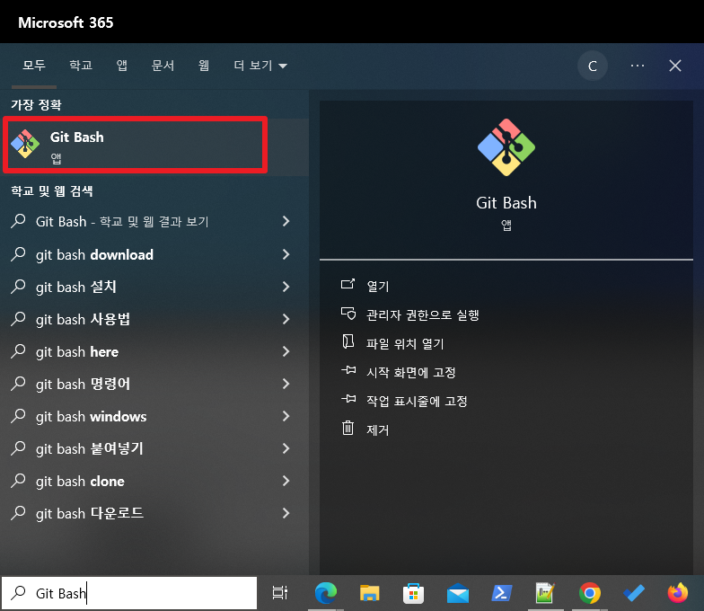 그리고, 시작메뉴에서도 git bash을 검색하여 다음과 같이 정상적으로 앱이 나타나는 것을 확인할 수 있습니다.