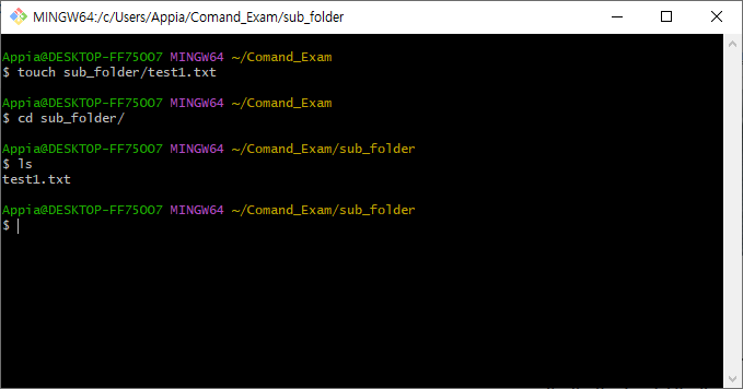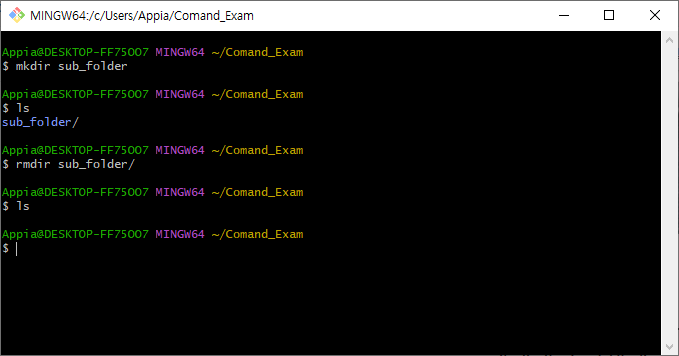 위의 명령어를 방법으로 다음과 같이 하위 폴더로 생성한 sub_folder 부분을 삭제했습니다.