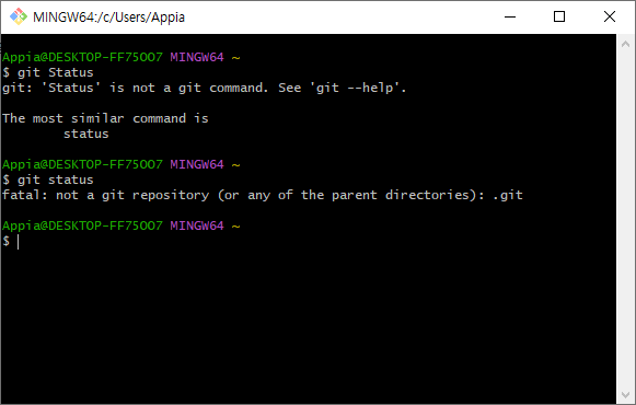 그리고 나서, 현재 해당 디렉토리에 repository가 있는지에 대해서 위에서 살펴본 git status 명령어를 통해서 살펴보겠습니다.
