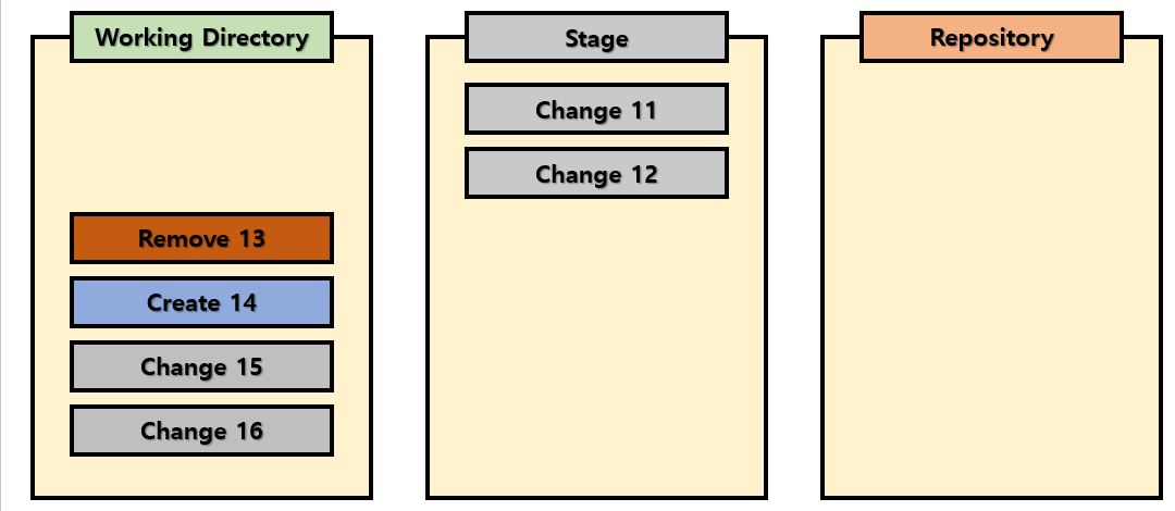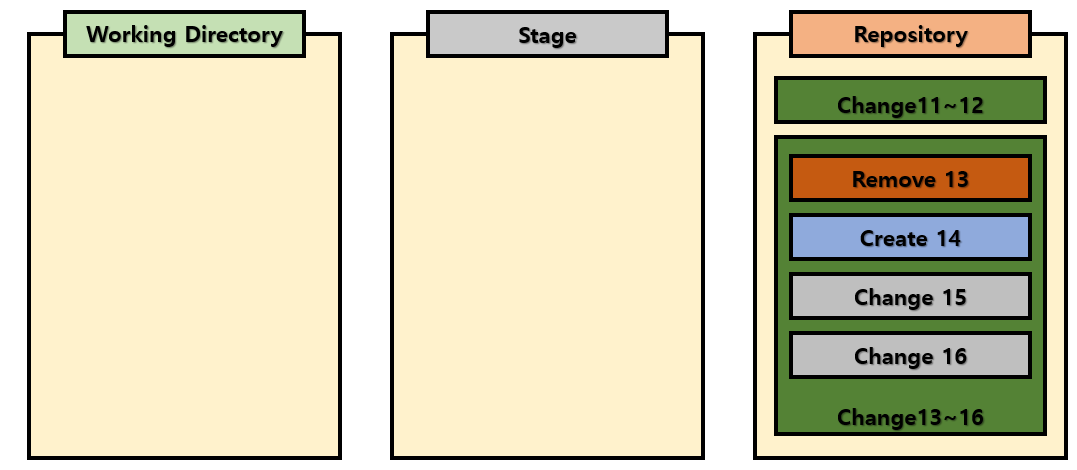 그런 후에 이 2가지 변경사항에 사항에 대해서 commit을 진행합니다. 그러면 현재 stage에 있던 2개의 파일이 한개의 commit으로 지점을 만들 수 있게 됩니다. 그러면 현재 13~16번에 해당하는 변경사항들이 존재하게 됩니다.