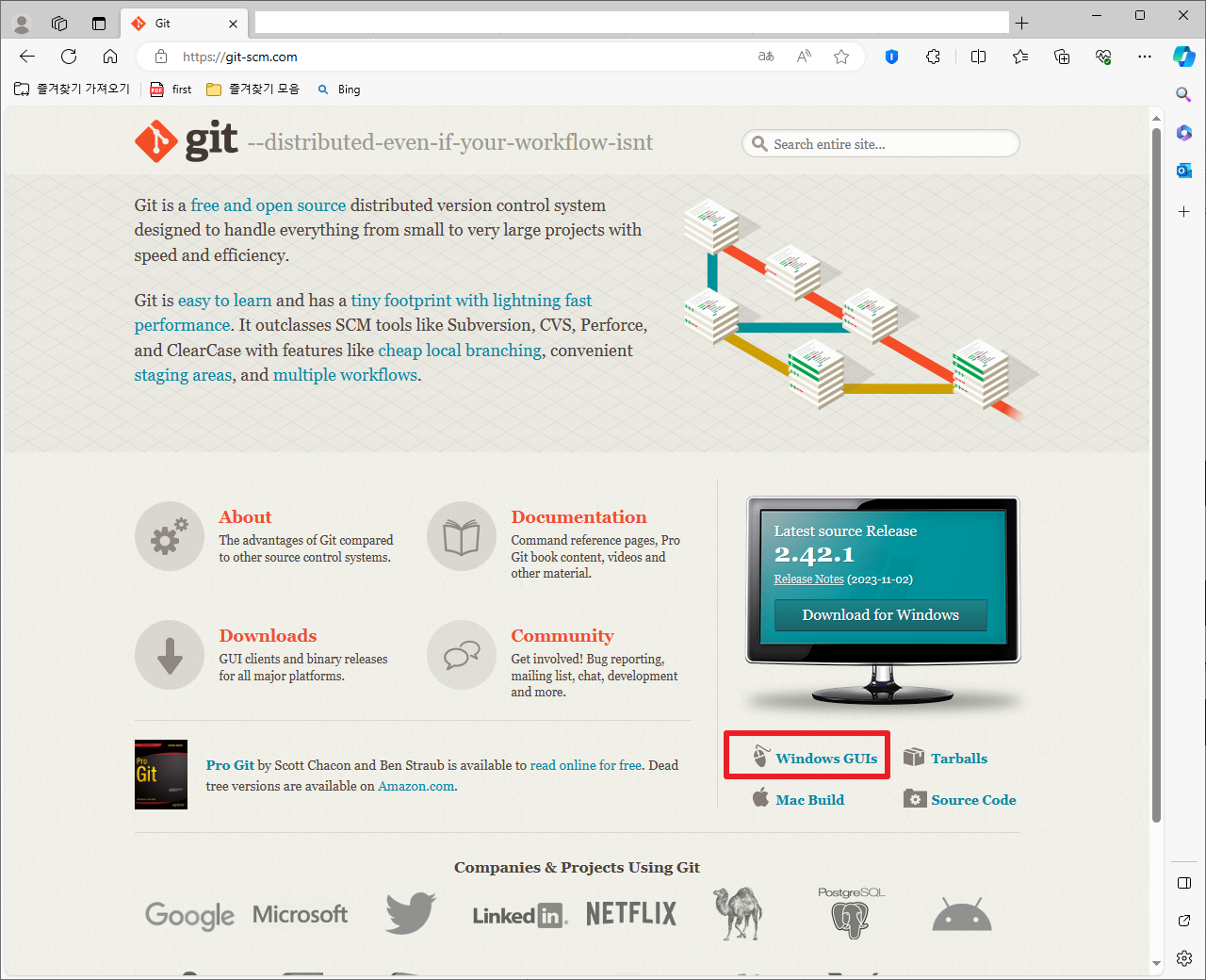 먼저, 상기 링크를 통해서 git 공식 페이지로 이동해주시길 바랍니다. 그러면, 화면 중간에 "Windows GUIs" 또는 모니터 화면의 좌측 부분에 존재하는 Downloads 부분을 클릭해주시면 됩니다.
