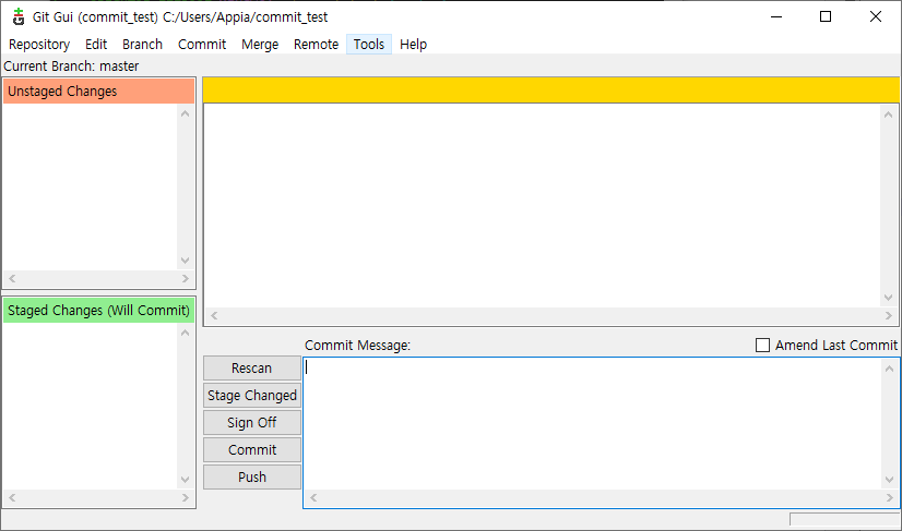 아마도, 파이썬(Python)에 대해서 익숙하신 분들은 tk라는 GUI 모듈을 잘 알고 계실 것이라고 생각합니다. 이 부분을 토대로 생성이 된것으로 보입니다. 그러면, 다른 기본 제공 gui인 "git gui"을 살펴보겠습니다. 이 또한 다음과 같은 명령어를 입력하여 실행하도록 하겠습니다.