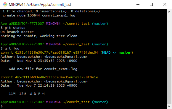 그런 후에 git log을 통해서 현재 commit 정보를 확인해보도록 하겠습니다. 방금 입력한 정보가 상단에 추가된것을 알 수 있습니다.