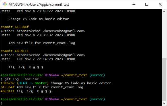 확연히 이제까지 봤던 commit 정보보다 줄여든 것을 확인할 수 있습니다. 한줄로, commit id/commit hash 와 Message만 출력이 되었습니다. 실제 GUI Client툴을 사용하다보면, 이런 부분에 대해서는 크게 살펴보지는 않지만, 저희는 Command부터 하나씩 습득하는 과정이기 때문에 이 부분또한 직접 실습해보시는 것을 권장드립니다.