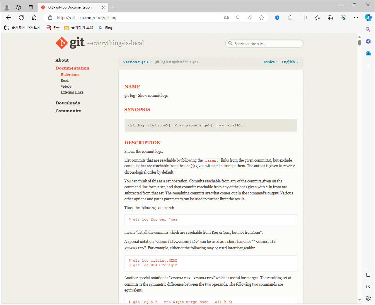 위의 commit 같은 경우 제가 블로그 포스팅을 위해서 예제로 만든 부분이기 때문에 몇개 안되고, message 자체도 매우 간단합니다. 하지만, 실제 개발을 진행하시면, 몇십개에서부터, 몇개의 commit이 존재할 수 있습니다. 그래서 위에서 언급한 git commit 정보를 확인하는 git log 명령어에 대해서 조금 더 자세하게 보는 것이 좋은듯 합니다. 앞선, git 공식 문서의 내용 보는 방법이 있는 부분을 참조하여 git log에 대해서 살펴보도록 하겠습니다.