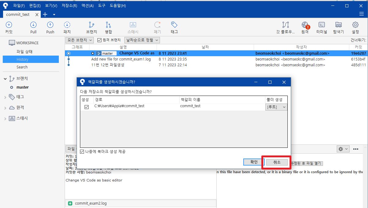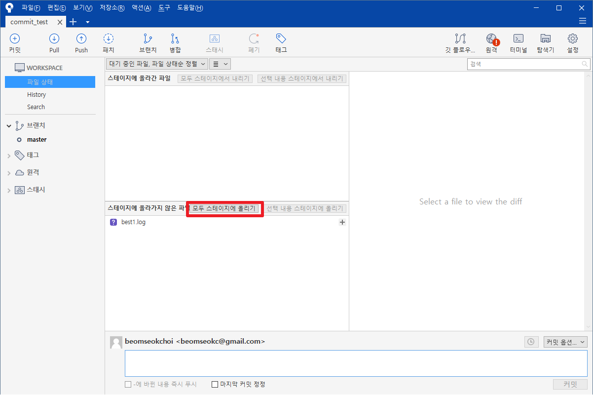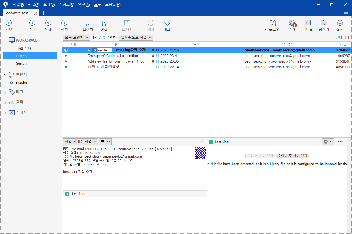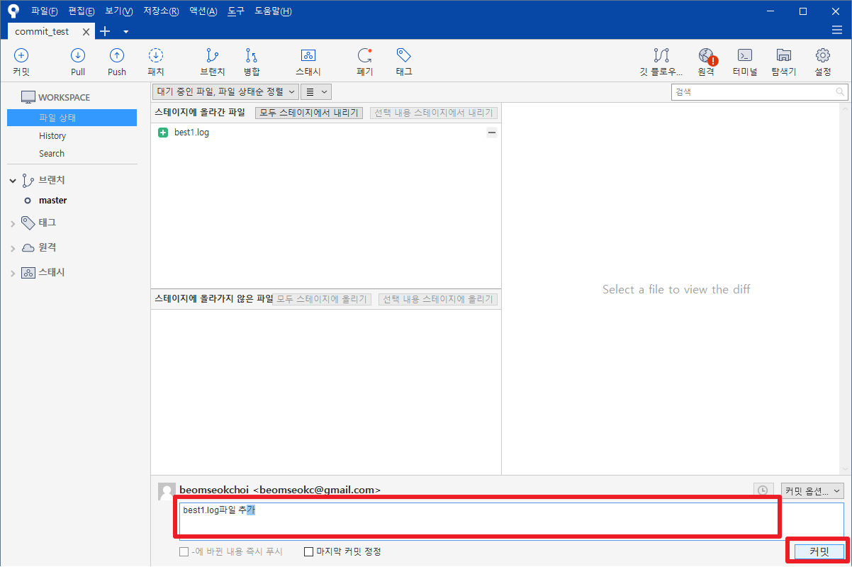 그러면, 이전과 같이 message을 입력하고 나서, [커밋]부분을 클릭하여 커밋을 진행하도록 하겠습니다. 저의 경우 "best1.log파일 추가"라는 message을 입력하도록 하겠습니다.