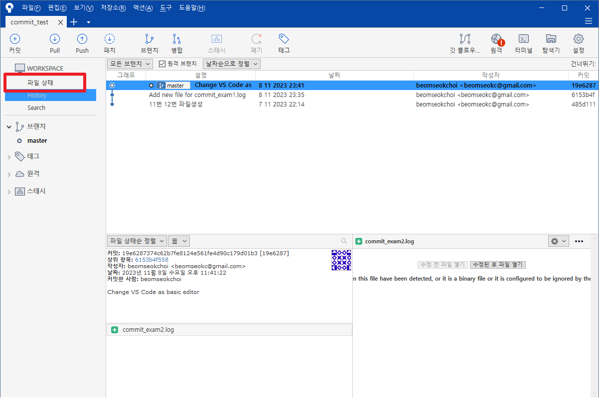 위의 단계까지 진행하시면, 다음과 같은 화면이 나타나는 것을 알 수 있습니다. 저희가 앞선 포스팅에서 봤던 git log --oneline보다 깔끔하고 시인성이 좋습니다. 실제로 이러한 점떄문에 대부분 사람들은 GUI Client를 사용합니다. 그러면 여기에서, 좌측에 있는 [파일 상태]부분을 클릭하여 주시길 바랍니다.