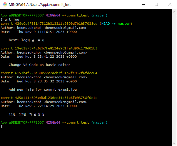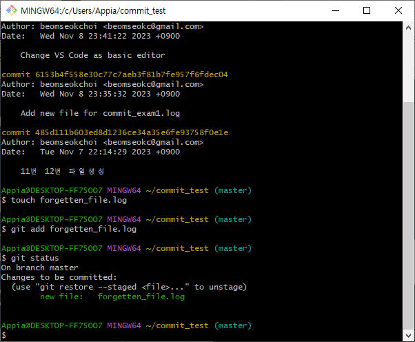위와 같은 방법으로 기존 마지막 commit의 메시지를 수정하고 저장 후에 종료하도록 하겠습니다. 그랬더니, 다음과 같이 commit이 진행된 것을 알 수 있습니다.
