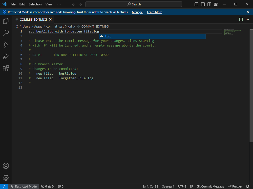그랬더니, 이전에 설정된 에디터 창을 통해, 현재 commit 메시지가 나타난 것을 알 수 있습니다. 이 부분을 수정해보도록 하겠습니다.