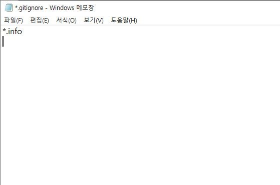 그럼 먼저, info의 확장자를 가지는 모든 파일을 git에서 무시하도록 해보겠습니다. 저의 경우 윈도우 탐색기를 열어서, 해당 파일을 수정하였습니다.