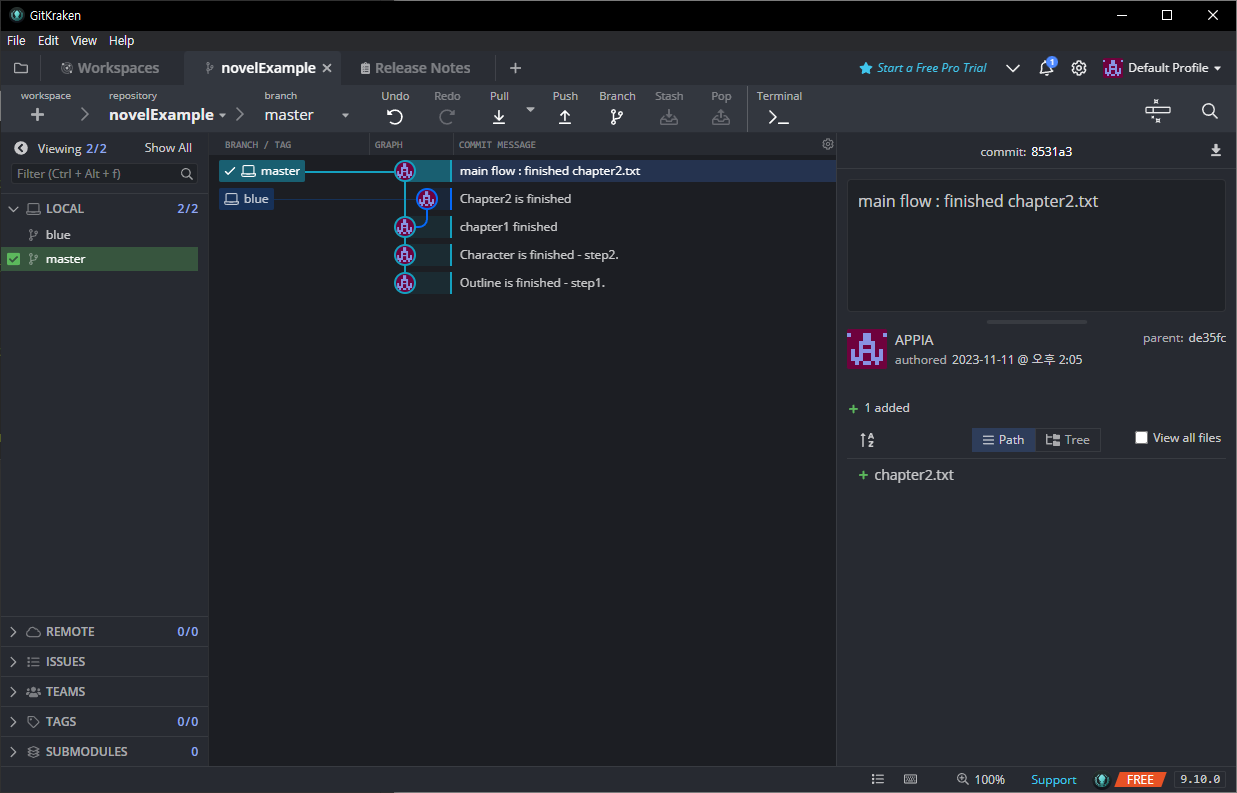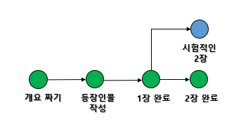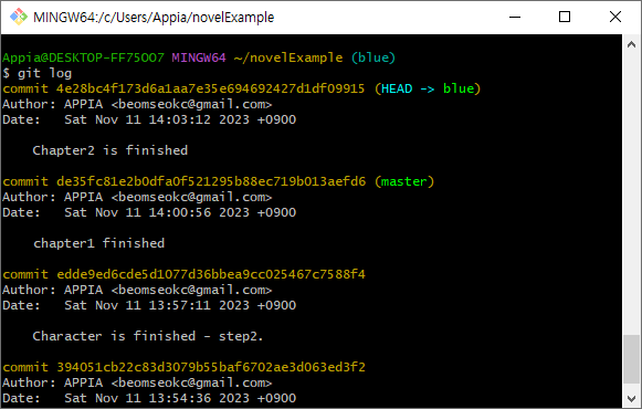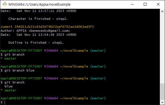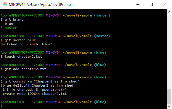 다시 예제로 돌아와서, 저희는 blue라는 브랜치를 만들고, 여기에 chapter2.txt를 시험적으로 작성하도록 하겠습니다.