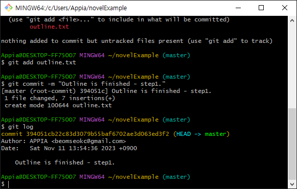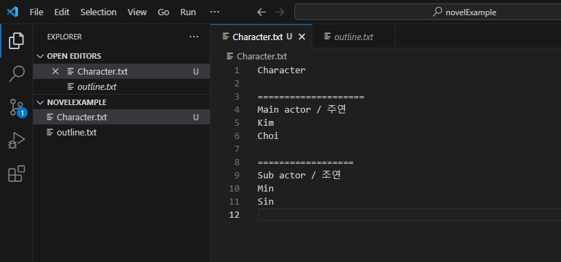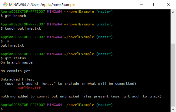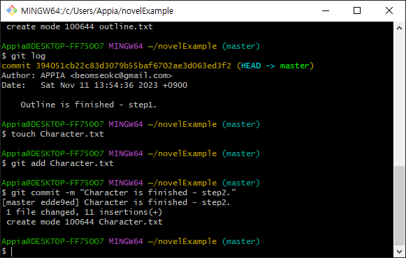 그리고, 추가로 character.txt라는 파일을 생성하고, 이 부분을 commit하도록 하겠습니다.