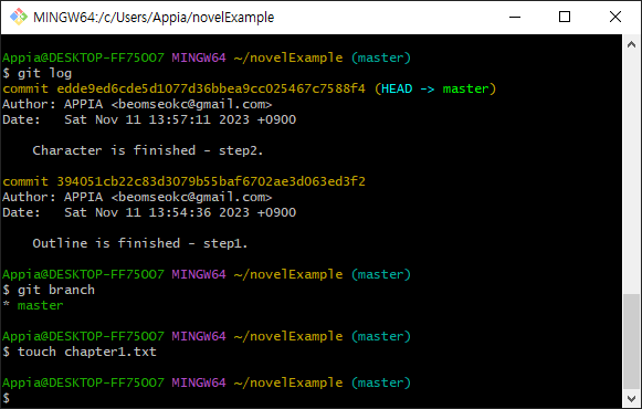 그러면 다시 마스터로 돌아가서, 저희는 chapter2.txt를 수정하도록 하겠습니다. 그리고 나서, 다음 부분에 대해서 chapter2.txt를 작성하고 commit하도록 하겠습니다.