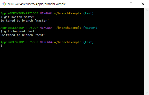 위의 명령어를 통해서 작업하고 있는 브랜치를 변경할 수 있습니다. 저의경우에는 checkout을 사용하지는 않습니다. switch와 약간의 편차가 있기 때문입니다. 일단, 그 부분은 나중에 이야기를 한번 다루어 보도록 하겠습니다. 그러면 예시를 통해서 살펴보겠습니다.