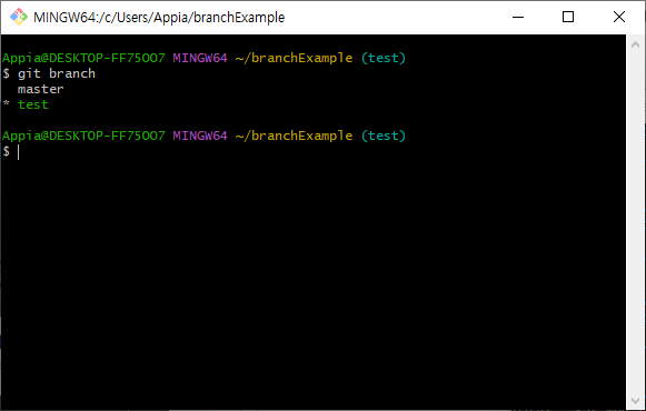 위의 과정을 실행하시면, Switched to branch 'test'라는 이름으로 출력이 되고, branch(브랜치)가 변경된 것을 알 수 있습니다.
