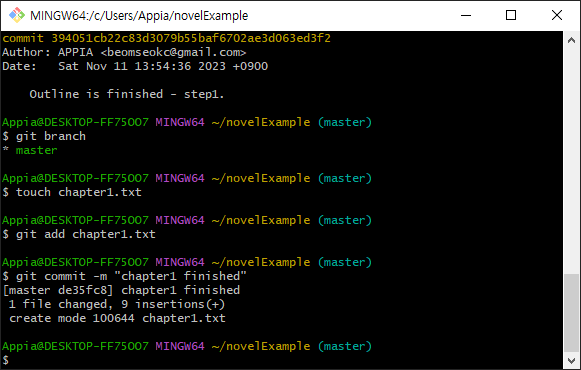 그리고, 추가로 chapter1.txt라는 파일을 생성하여 이 부분을 작성하고 commit을 하도록 하겠습니다.