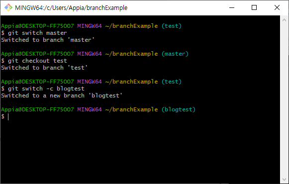 이와 같은 방법으로 git branch(깃 브랜치)을 생성하고, 전환할 수 있습니다.