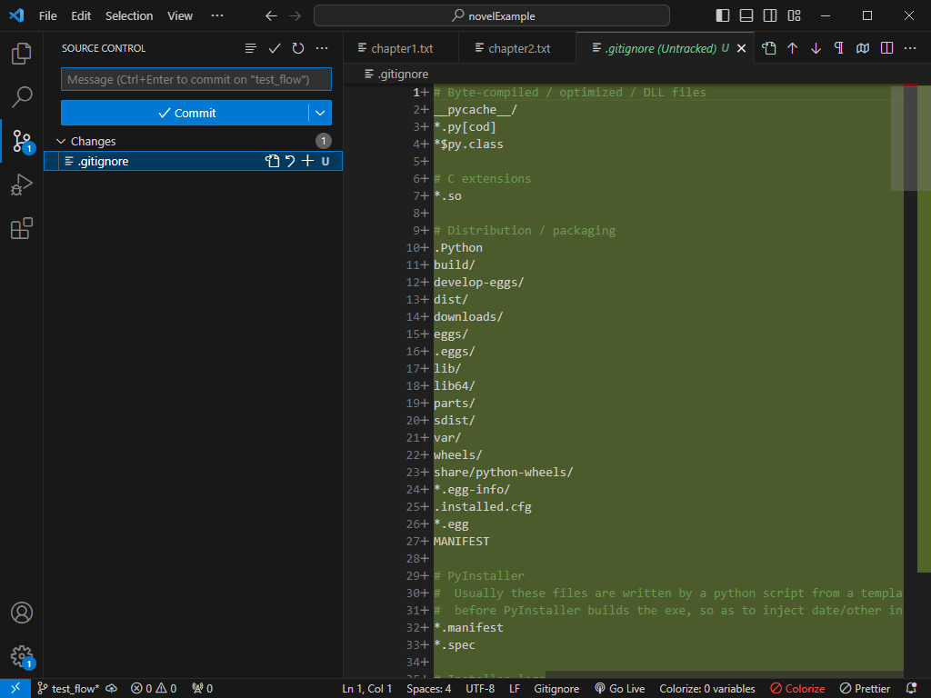 저의 경우 위에서 "Python"을 검색하였고, 그런 후에 우측 하단에 다음과 같이 gitignore파일이 생성되었다는 화면이 나타납니다.