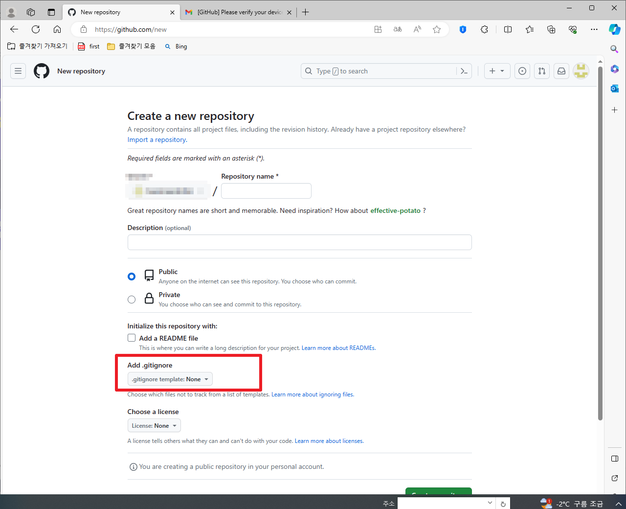 그런 후에 생성시에 "Add .gitignore" 부분에서 template 부분을 선택해주시면 됩니다.